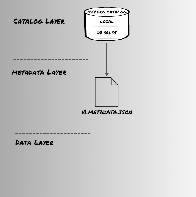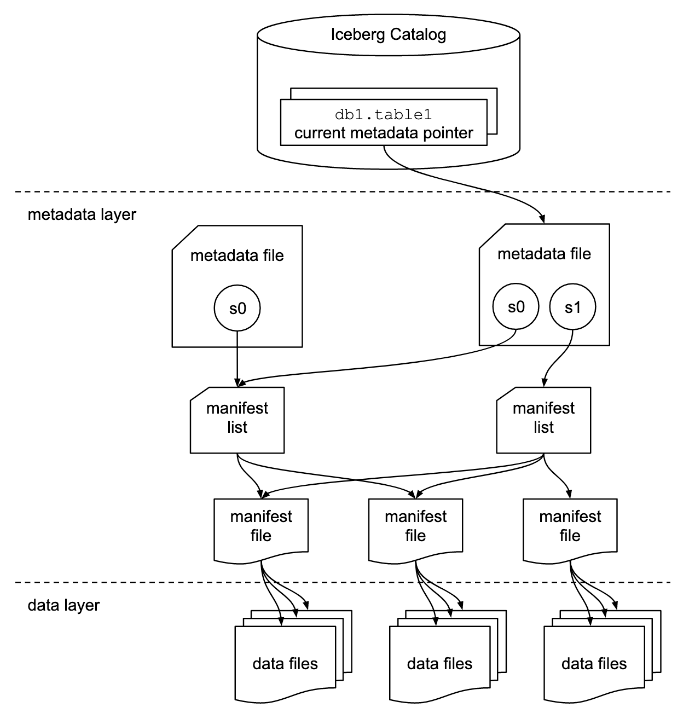 Within the Catalog layer, there is a reference or pointer, that points to the current metadata file for that table.