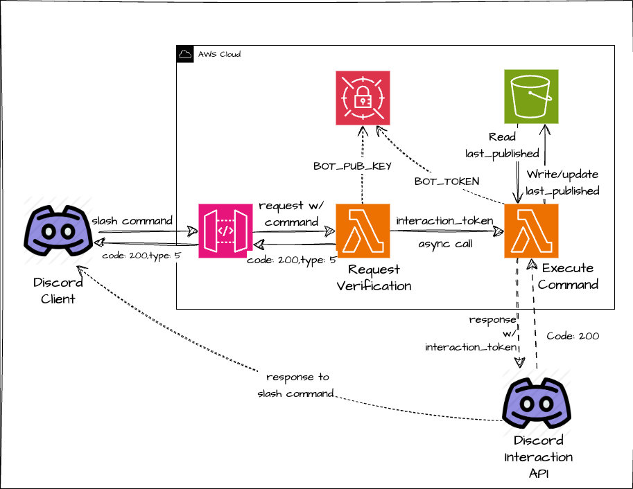 - Request Verification Lambda: Lambda function to verify that the request is originally being sent via Discord servers by validating the signature and timestamp of the headers of the request. We will look more into this later in the post.